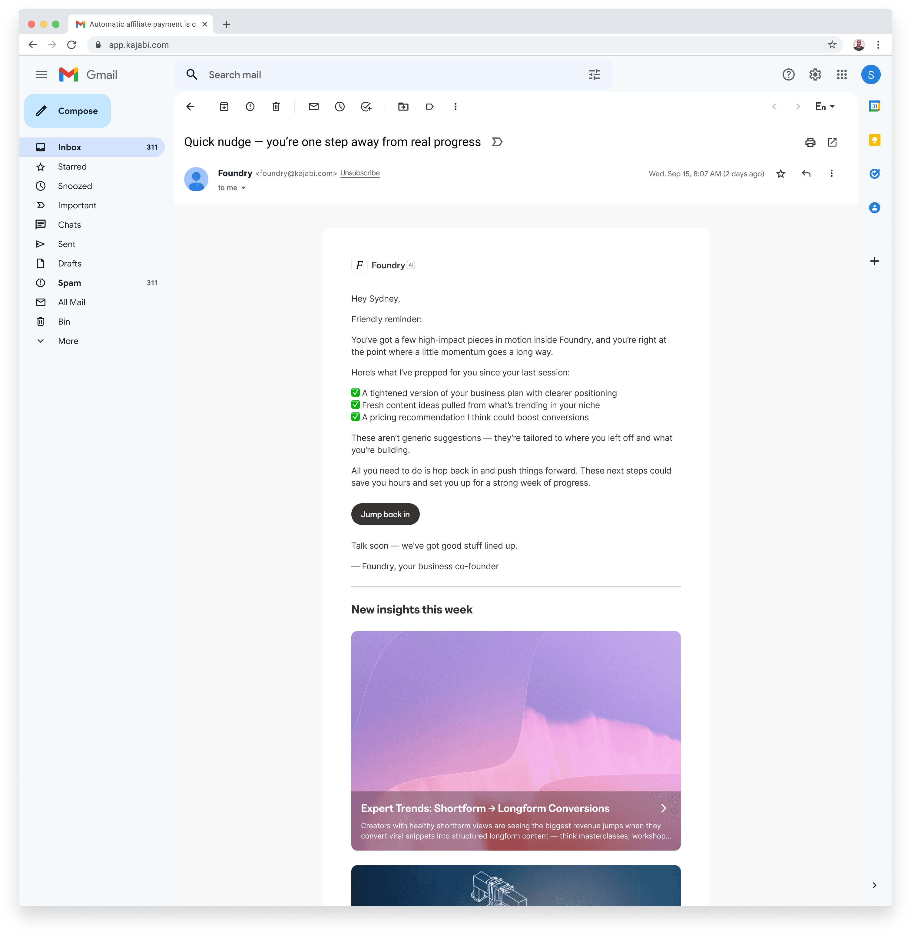 Foundry was a complex, multi-layered design challenge: creating Kajabiโs first agentic workflow system that could translate ambiguous creator intent into structured, shippable outputs. I defined the interaction model, conversation architecture, and UI framework that allowed Foundry to behave more like a strategic partner than a chatbot. My work spanned mapping nonlinear journeys, designing guardrails for unsupported intents, building patterns for AI-driven tool actions, and shaping the behavioral tone that keeps the assistant both capable and safe. This required balancing open-ended reasoning with product constraintsโultimately giving the platform a scalable foundation for future agentic features.